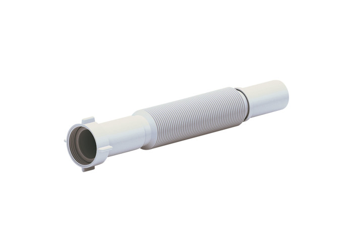 Гибкая труба ANI PLAST К203 выполнена из пластика классического белого цвета в виде прямой трубы, которая благодаря наличию гофры может изменять угол и длину от 360 мм до 750 мм. Изделие обладает небольшим весом, поэтому устанавливается без особых усилий и дополнительного приспособления. Благодаря материалу изготовления труба имеет длительный срок эксплуатации, устойчива к образованию коррозии и затворов, высоким температурам и химическим средствам.