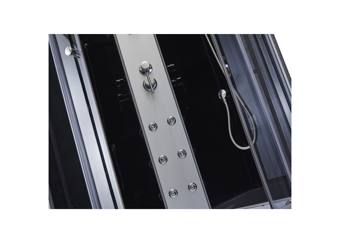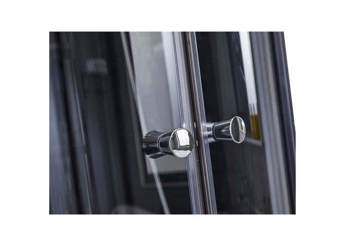 Поддон, сифон, двери, ручки, двойные ролики, профиль, крепежи, задняя стенка, глухое стекло, стеклянные двери, смеситель, лейка для ручного душа, лейка для верхнего душа, душевой шланг, кронштейн, ножки, гидромассажные форсунки, верхняя крышка, переходник 32/50 мм, полка.