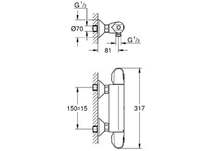 Термостат для душа 1/2", настенный монтаж. Рукоятка расхода с экономичной кнопкой GROHE EcoButton и индивидуально устанавливаемым стопором. Встроенный стопор смешанной воды.