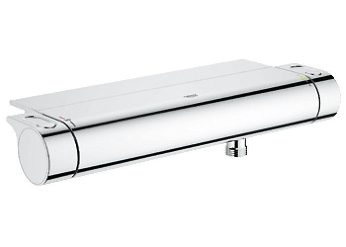 Термостат для душа с полочкой, встроенный термоэлемент, керамический вентиль 1/2", 180°, стопор безопасности при 38°C, встроенный стопор смешанной воды, рукоятка расхода с экономичной кнопкой и индивидуально настраиваемым стопором, отвод для душа снизу 1/2", хром, встроенные обратные клапаны, грязеулавливающие фильтры, скрытые S-образные эксцентрики, с защитой от обратного потока; полочка съемная