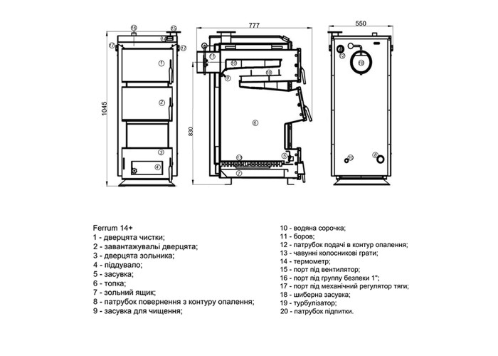 Габаритні розміри котла (ВхШхГ), мм 1045х550х777