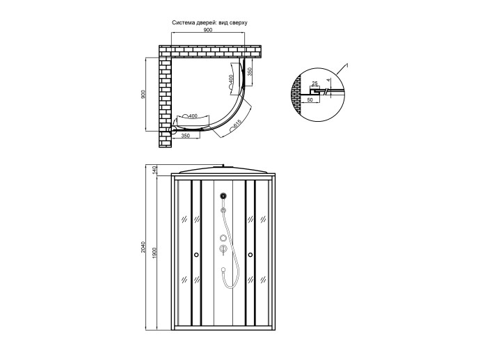 Ручки, подвійні ролики, профіль, комплект кріпильних деталей, задня стінка, глухе скло, скляні двері, душова панель, змішувач, лійка для ручного душа, лійка для верхнього душа, душовий шланг, кронштейн, верхня кришка, скляна полиця.