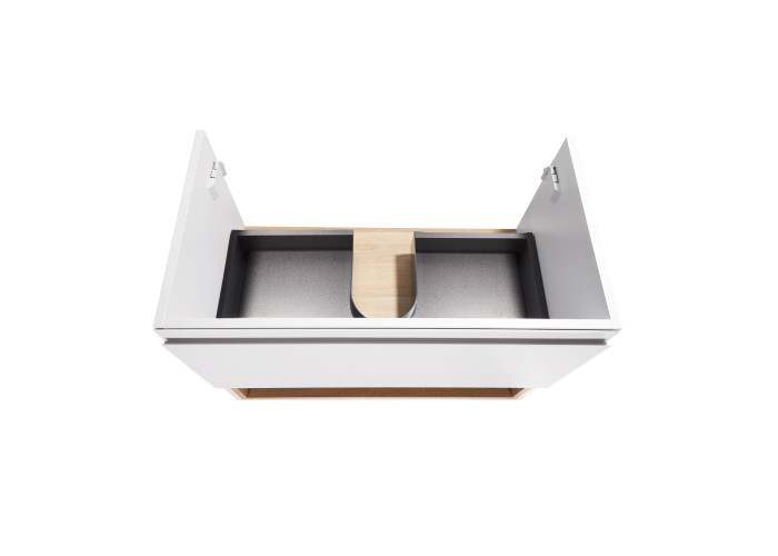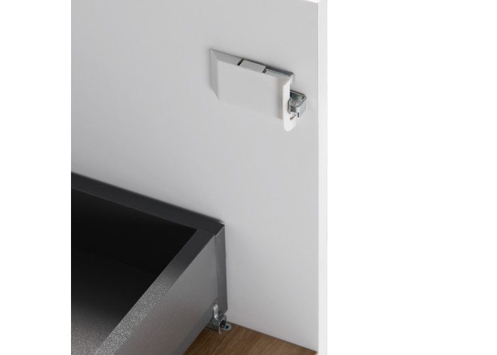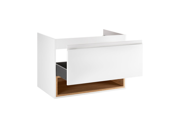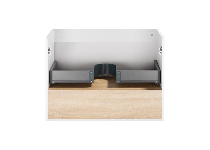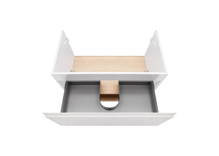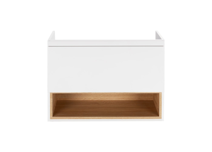 Підвісна тумба Qtap Robin QT1374TPВ8001WWO виконана з отвором під сифон. Корпус тумби білого кольору виготовлений з ЛДСП, фасадна частина з МДФ з глянцевим покриттям. Виріб оснащений зручним і містким висувним ящиком з механізмом доводчика, а також стильною полицею кольору білого дуба. Тумба виконана в елегантному лаконічному стилі і впишеться в дизайн будь-якої ванної кімнати. Завдяки підвісній конструкції прибирання приміщення не завдасть зайвого клопоту.