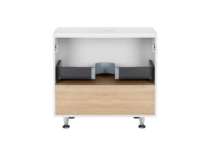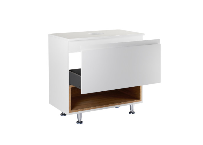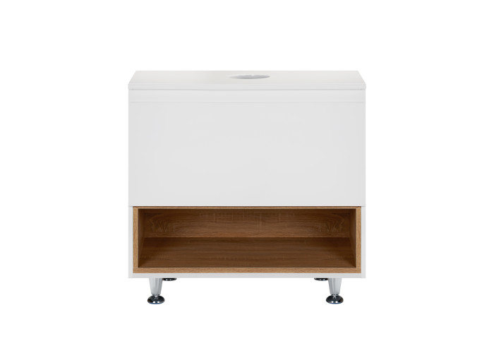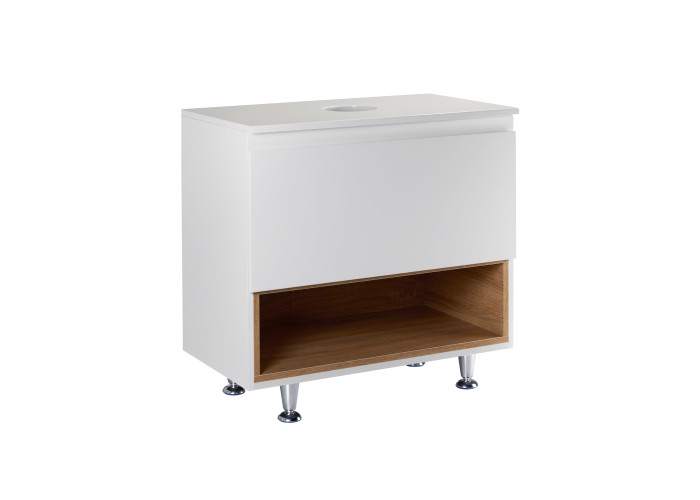 Підлогова тумба Qtap Robin QT1380TNН7001WWO виконана з отвором для встановлення накладної раковини, а також отвором під сифон. Корпус тумби сірого кольору виготовлений з ЛДСП, фасадна частина з МДФ з глянцевим покриттям. Виріб оснащений зручним і містким висувним ящиком з механізмом доведення, а також стильною полицею кольору білого дуба. Тумба виконана в елегантному лаконічному стилі і пасуватиме до дизайну будь-якої сучасної ванної кімнати.