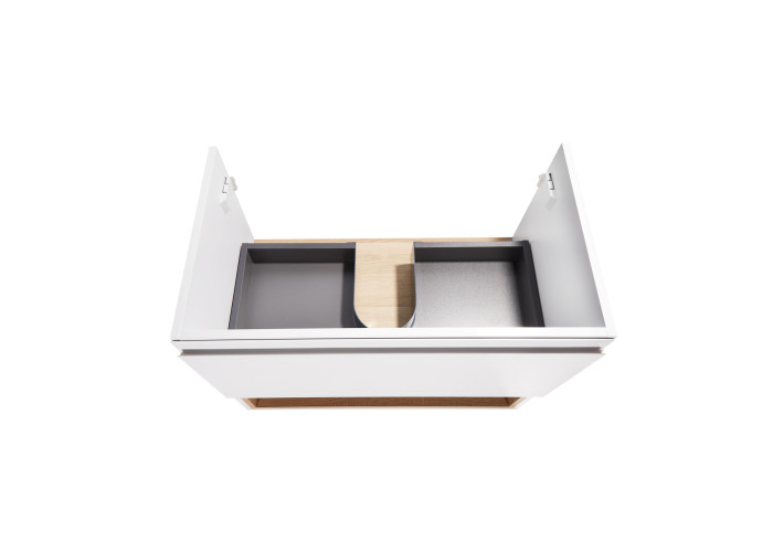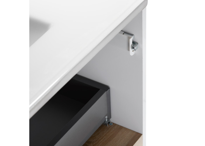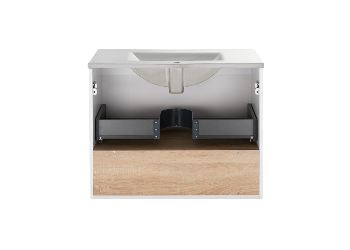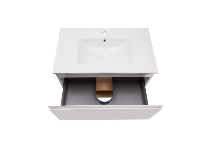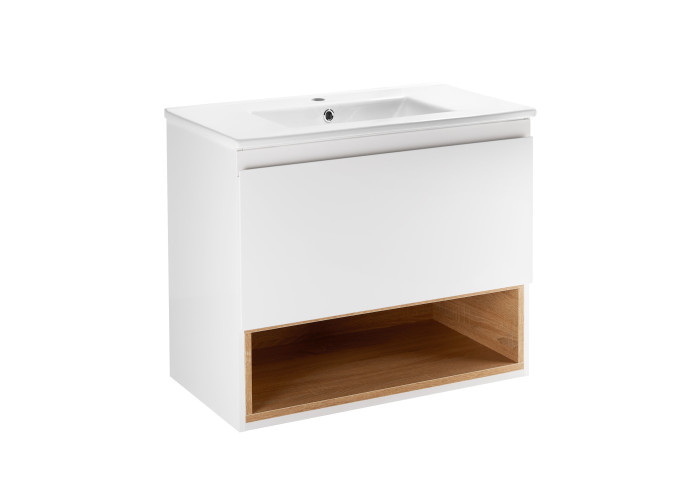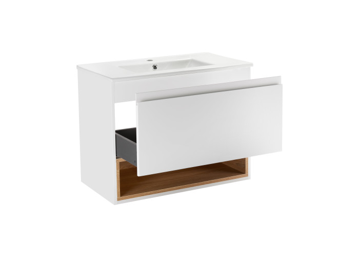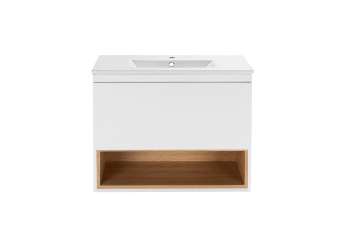 Підвісна тумба з раковиною Qtap Robin QT1372TPВ7001WWO виконана в лаконічному стилі, що доповнить дизайн будь-якої ванної кімнати. Раковина виготовлена з якісної кераміки білого кольору, вона має отвір під сифон і перелив. Корпус тумби білого кольору виготовлений з ЛДСП, фасадна частина з МДФ з глянцевим покриттям. Виріб оснащений зручним і містким висувним ящиком з механізмом доведення, а також стильною полицею кольору білого дуба.