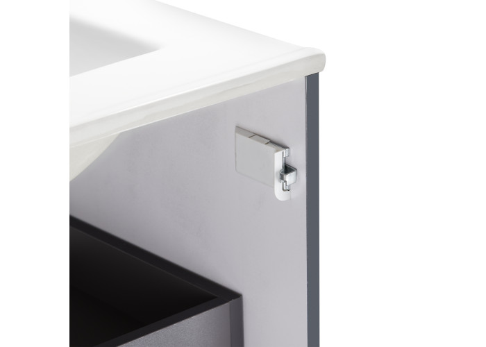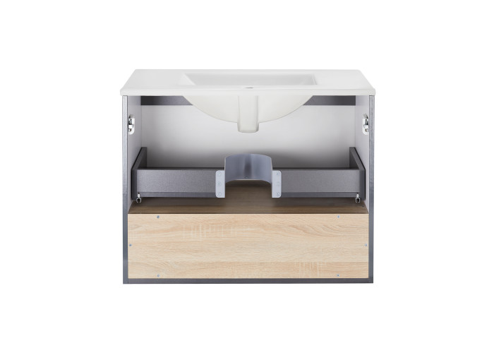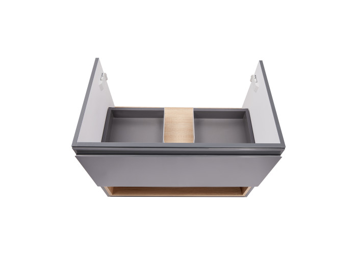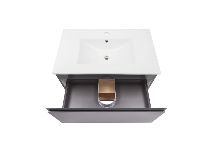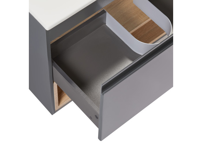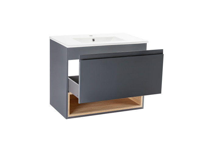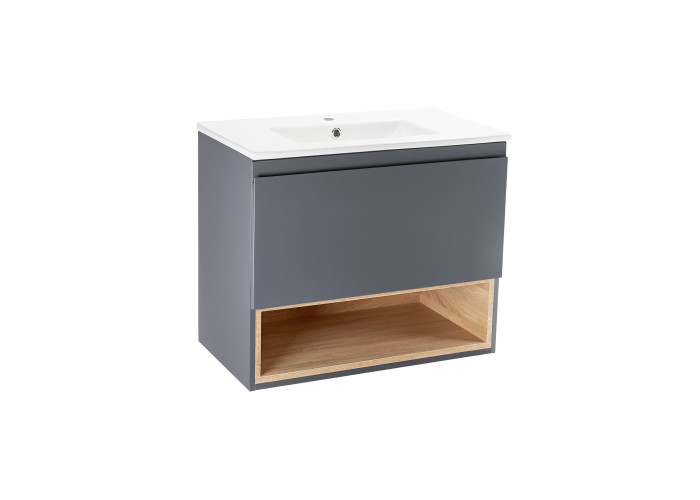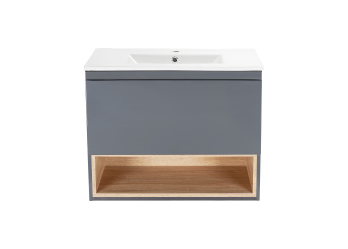 Підвісна тумба з раковиною Qtap Robin QT1372TPВ7002GWO виконана в лаконічному стилі, що доповнить дизайн будь-якої ванної кімнати. Раковина виготовлена з якісної кераміки білого кольору, вона має отвір під сифон і перелив. Корпус тумби сірого кольору виготовлений з ЛДСП, фасадна частина з МДФ з глянцевим покриттям. Виріб оснащений зручним і містким висувним ящиком з механізмом доведення, а також стильною полицею кольору білого дуба.
