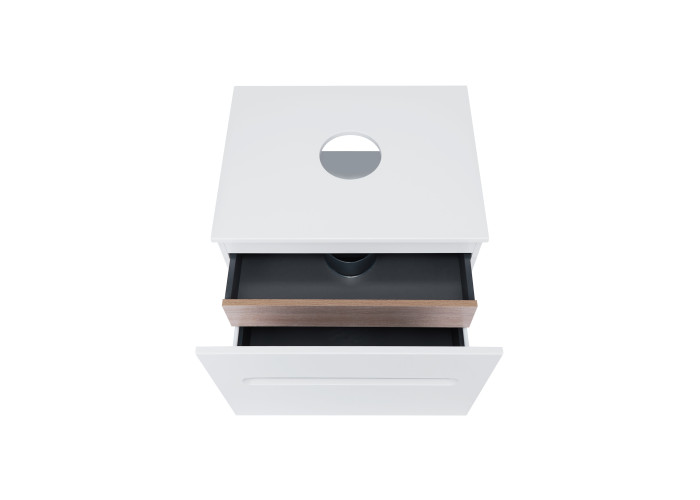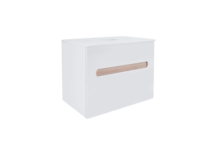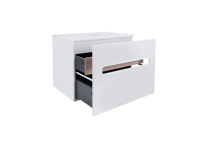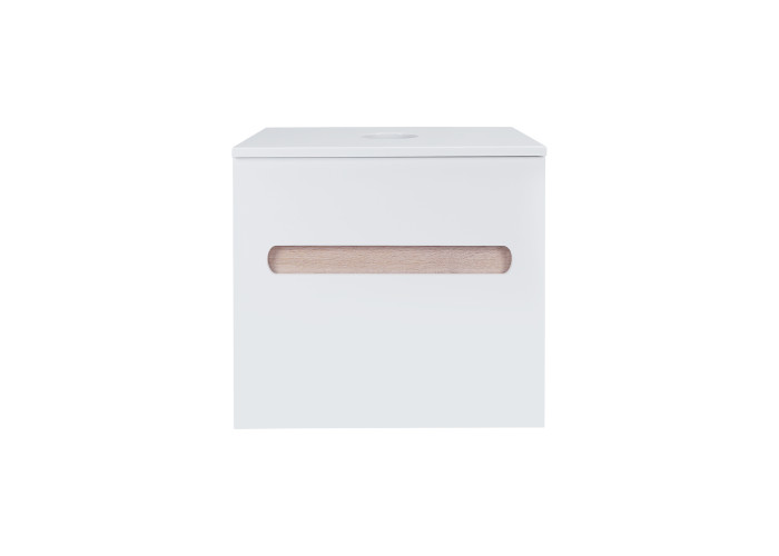 Підвісна тумба Qtap Virgo 600х476х469 White/Whitish oak зі стільницею QT1879TPА601WWO виконана з отвором для встановлення накладної раковини, а також отвором під сифон. Корпус тумби білого кольору виготовлений з ЛДСП, фасадна частина з МДФ. Виріб оснащений зручними і місткими висувними ящиками з механізмом доведення. Прихований внутрішній ящик кольору білого дуба надає тумбі оригінальний зовнішній вигляд, завдяки якому вона впишеться в дизайн будь-якої сучасної ванної кімнати.
