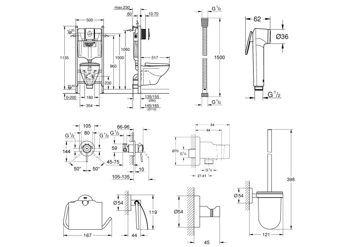Інсталяція з унітазом Solido Compact комплект 4 в 1 (39117000), набір для гігієнічного душу зі змішувачем BauClassic (111048), змішувач для ванни BauLoop (32815000), змішувач для раковини BauLoop (23337000), змішувач для кухні BauLoop (31368000), душовий гарнітур New Tempesta 100 (27598001), гачок для одягу Essentials (40364001), тримач туалетного паперу з кришкою Essentials (40367001), йоржик для унітазу з колбою Essentials (40374001)