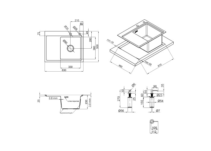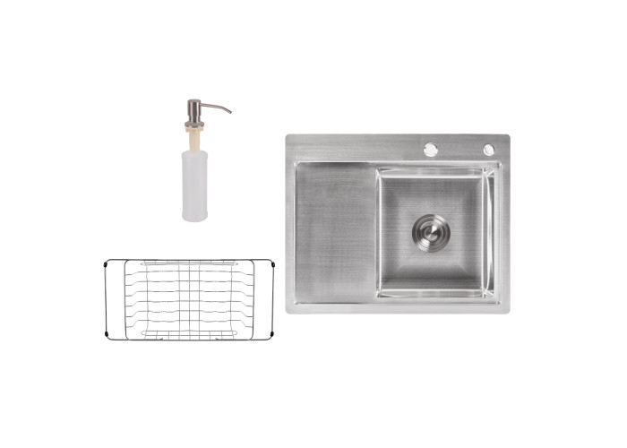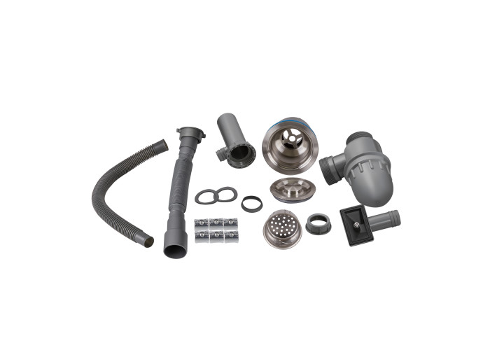 Мийка, дозатор, сифон, слив/перелив, кошиковий вентиль, сушка для посуду, кріпильні деталі.