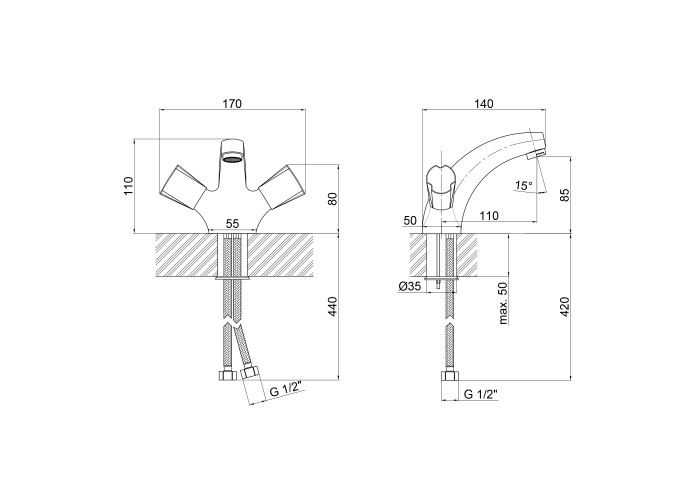 Змішувач для раковини Lidz (CRM) Mix 17 161 виготовлено з якісної латуні з глянцевою хромованою поверхнею. Він монтується в отвір для змішувача на раковині або на стільниці врізним способом. Напір води і її температура регулюються поворотом вентелів в необхідне положення. Підключення води здійснюється за допомогою шлангів гнучкого підведення, що входять до комплекту постачання.