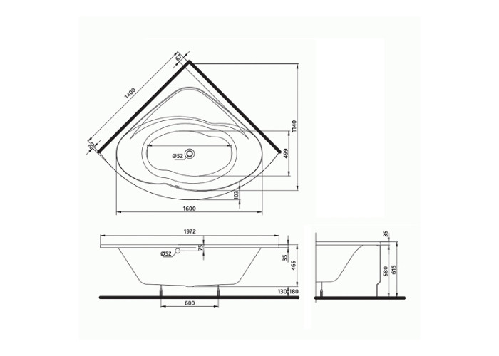 Ванна акриловая Коло-Дымер с ножками, угловая. Длина 1400 мм, ширина 1400 мм, глубина 465 мм, объём 270 л. Для пристенного монтажа