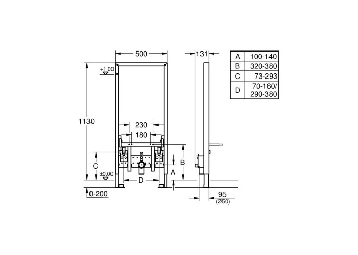 Подготовлена для облицовки. Редуктор Ø 90/110 мм впускной и смывной гарнитуры. Арматурная группа I с изоляцией от конденсационной влаги. Подключение воды DN 15. Без принадлежностей для монтажа.
