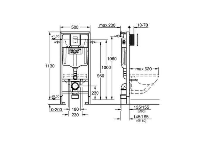 Инсталляционная рама, смывной бачок, ревизионный короб, звукоизоляционная прокладка, панель смыва Skate Air (38732000), комплект для переоснащения GROHE Fresh, крепежи.
