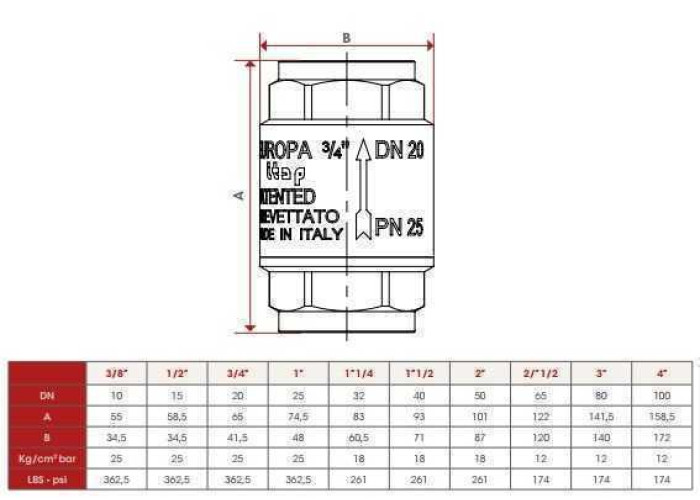 Технические характеристики Клапан обратного хода воды ITAP(100) 1/2" EUROPA с латунным штоком: