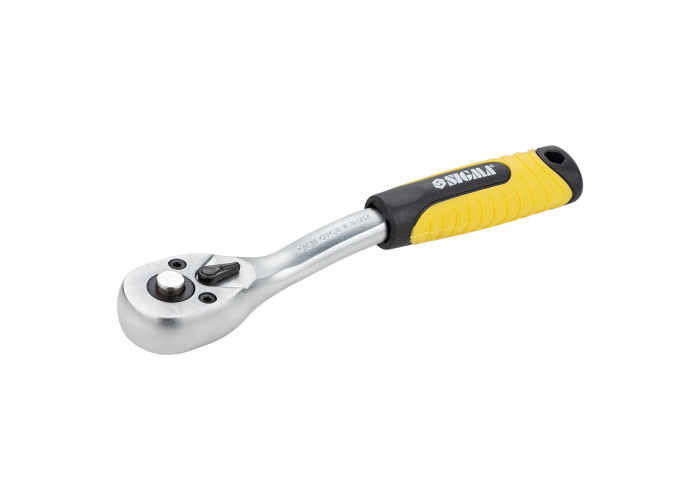 Ключ-трещотка с изогнутой ручкой 1/4" 150мм 72T CrV Sigma (6050071) предназначен для монтажа и демонтажа резьбовых соединений. Применяется для слесарных работ, а также как инструмент на автосервисе при ремонте узлов автомобилей. Устройство трещоточного ключа довольно простое: изогнутая рукоятка и головка, в которой размещен храповый механизм. Дополнительный изгиб рукоятки позволяет работать в труднодоступных местах. Реверсивный механизм, которым оборудован ключ-трещотка, позволяет выбирать направление вращения инструмента. Храповый модуль позволяет демонтировать крепежные элементы без отрыва инструмента от откручиваемой детали. Это весьма ценное качество, благодаря которому возможно осуществлять монтажные и демонтажные работы в местах с ограниченным пространством. Ключ-трещотка имеет небольшой крутящий момент, работает плавно и мягко, что обеспечивает комфорт во время работы. Конструкция предусматривает кнопку быстрого сброса для быстрой смены торцевых головок. Для увеличения износостойкости и долговечно