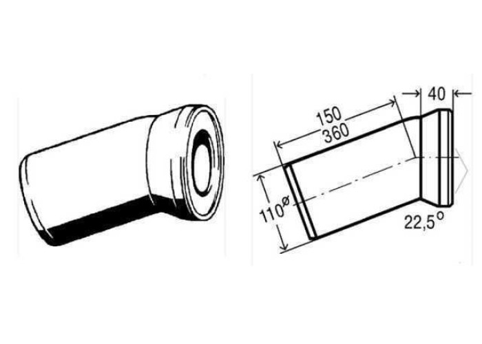 Коліно Viega застосовується для зєднання унітазу, компакта з каналізаційною трубою, діаметром 110 мм, під кутом в 22,5 °. Комплектується спеціальним манжетом для ущільнення зєднання.