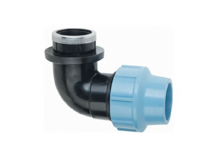 Коліно для поліетиленових труб, внутрішня різьба Ø75 х 2". Компресійні фітинги застосовуються для створення зовнішніх водопроводів, поливних систем і використовуються переважно для транспортування холодної води. Переваги: доступність за ціною, невелика вага, швидкий і легкий монтаж, що не вимагає додаткових інструментів, можливість створення роз'ємних з'єднань. Номінальна температура для застосування 20˚С, а максимальна робоча температура - до 60˚С в межах робочого діапазону труб. Номінальний тиск залежить від діаметра: для 16, 20, 25, 32, 40, 50, 63 мм воно складає 16 бар, для фітингів 75, 90 і 110 - 12,5 бар відповідно. Компресійні фітинги виробляються відповідно до стандартів UNI, ISO, DIN, NF, різьба відповідно до UNI, а фланцеві з'єднання відповідають вимогам UNI і DIN. Всі фітинги виконані відповідно до загальних технічних умов. Для виготовлення фітингів використовується чорний поліпропілен для корпусу, чорна прокладка з нітрилової гуми, біле затискне кільце з поліацетата і гайка з поліпропілену.