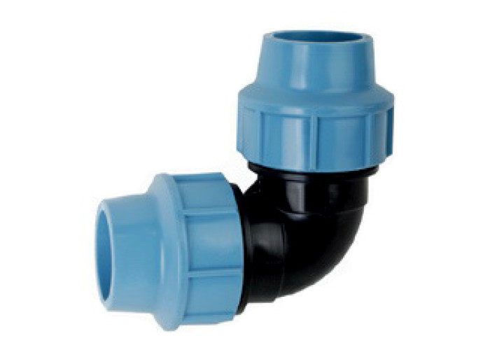 Коліно затискне для поліетиленових труб, різьба Ø90. Компресійні фітинги застосовуються для створення зовнішніх водопроводів, поливних систем і використовуються переважно для транспортування холодної води. Переваги: доступність за ціною, невелика вага, швидкий і легкий монтаж, що не вимагає додаткових інструментів, можливість створення роз'ємних з'єднань. Номінальна температура для застосування 20˚С, а максимальна робоча температура - до 60˚С в межах робочого діапазону труб. Номінальний тиск залежить від діаметра: для 16, 20, 25, 32, 40, 50, 63 мм воно складає 16 бар, для фітингів 75, 90 і 110 - 12,5 бар відповідно. Компресійні фітинги виробляються відповідно до стандартів UNI, ISO, DIN, NF, різьба відповідно до UNI, а фланцеві з'єднання відповідають вимогам UNI і DIN. Всі фітинги виконані відповідно до загальних технічних умов. Для виготовлення фітингів використовується чорний поліпропілен для корпусу, чорна прокладка з нітрилової гуми, біле затискне кільце з поліацетата і гайка з поліпропілену.