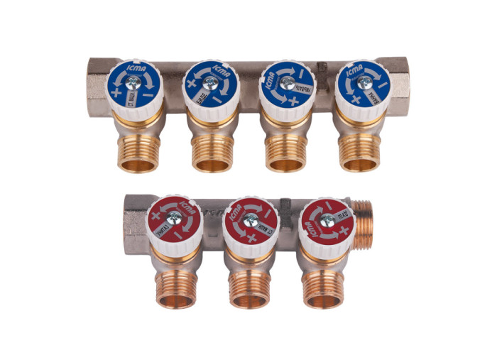 Распределительный коллектор с отсекающими вентилями. Подключение 1" и 3/4". Боковые выходы с резьбой 1/2". Межосевое расстояние 37,5 мм - 3/4" и 50 мм – 1". Простой сборный коллектор с отсекающими кранами предназначен для распределения потока в системах отопления и водоснабжения. Головные присоединения 3/4" и 1". Боковые выходы с резьбой 1/2". Шаг боковых выходов 37,5 мм для размера 3/4" и 50 мм для размера 1".