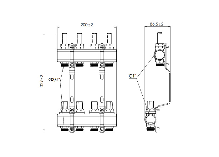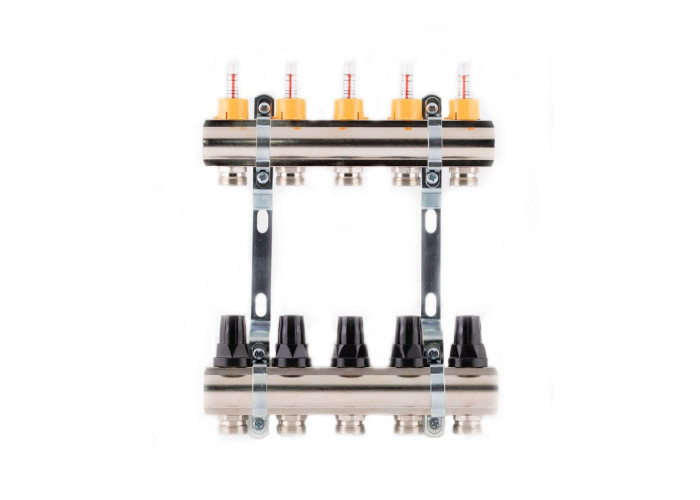 Колектор з витратомірами SD Forte 1" на 4 виходи — це колекторні латунні балки (подавальна з витратомірами та зворотного ходу з термостатичними клапанами) і два кронштейни для кріплення до стіни або в шафі. На термоклапанах — ручки управління. Є можливість під’єднання сервоприводів 30х1,5 (вони не входять в комплектацію). Пристрій здійснює рівномірний розподіл теплоносія по контурах системи «тепла підлога».