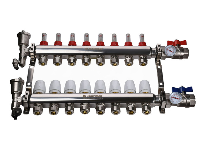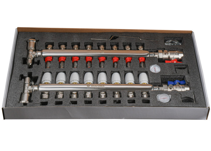 Матеріал колектора нержавіюча сталь, арматури і фітингів - латунь CW617N, ущільнювачами та золотникових прокладок - EPDM. У комплект входять кріплення.