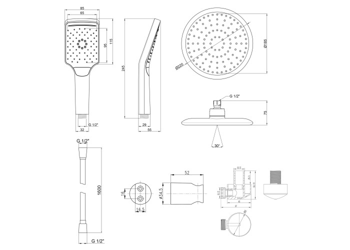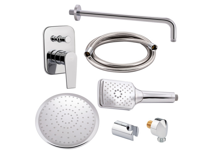 Змішувач прихованого монтажу, душовий шланг, кронштейн для ручного душу, лійка для верхнього душу, лійка для ручного душу, шлангове під‘єднання, кронштейн для верхнього душу, кріплення.