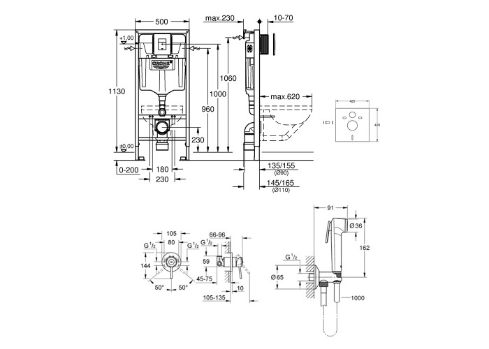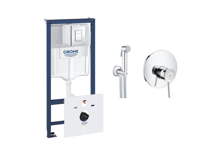 Инсталляция с панелью смыва: Grohe Rapid SL 38772001. Гигиенический душ со смесителем: Grohe BauClassic 2904800S
