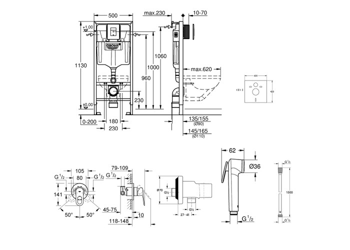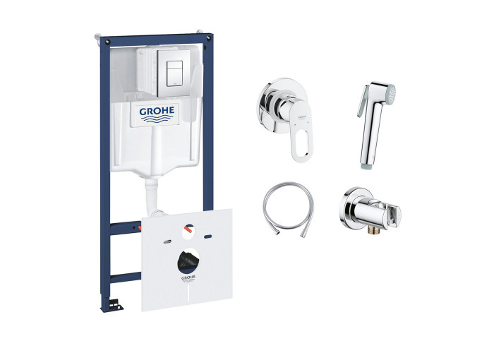 Инсталляция с панелью смыва: Grohe Rapid SL 38827000. Гигиенический душ со смесителем: Grohe BauLoop 111042