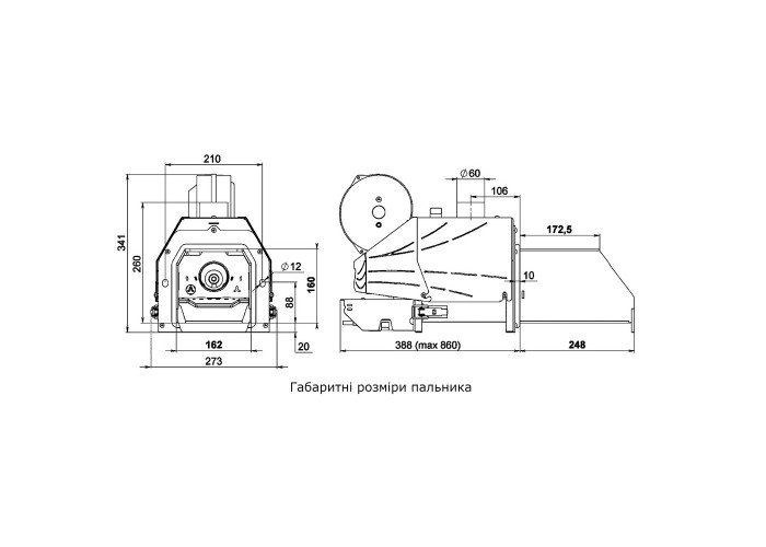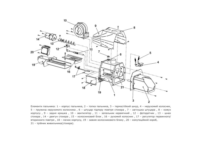 Пеллетная горелка, подающий шнек, гофрированный трубопровод, воздушный шланг, контроллер управления горелкой Ecomax Plum 860 с элементами электронной коммутации, паспорт, инструкция, гарантийный талон