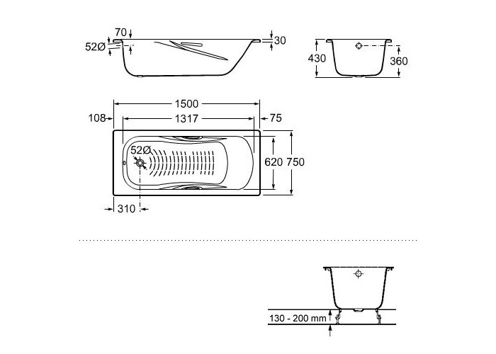 150*75см, с ножками и ручками. Материал - штампованная сталь толщиной 2,4мм. Трёхслойное покрытие эмали.