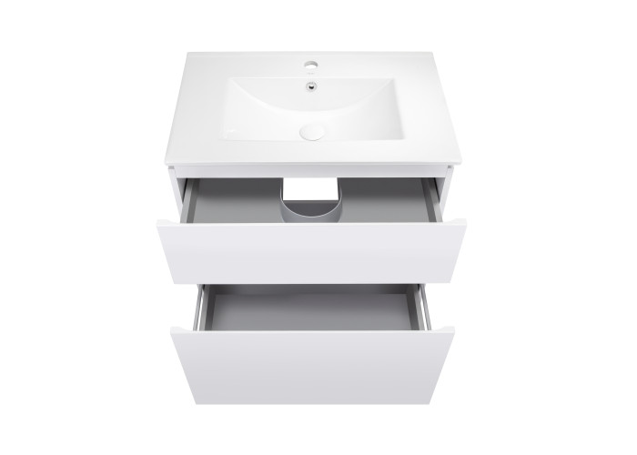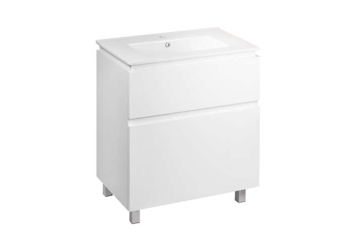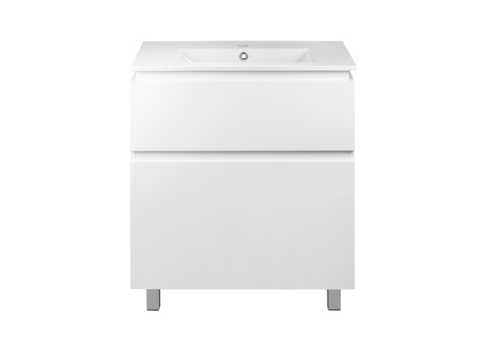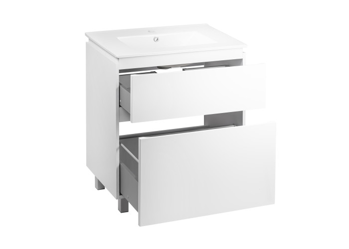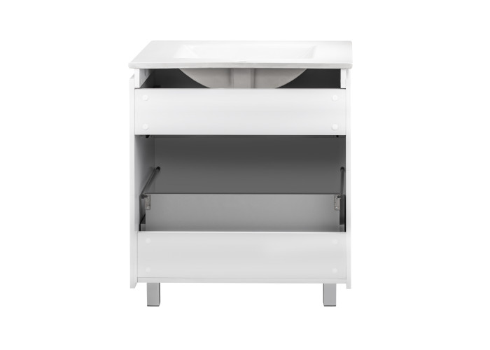 Тумба підлогова з раковиною Qtap Albatross QT0171TN800D3080CW виконана з отвором під сифон. У комплекті чотири хромовані ніжки з пластика з металевим каркасом. Корпус тумби виготовлений з ДСП, з двошаровою ламінацією білого кольору, фасадна частина з МДФ з глянцевим покриттям. Тумба оснащена двома висувними ящиками з механізмом доводчика. Виріб виконано в елегантному лаконічному стилі, який доповнить раковину і впишеться в дизайн будь-якої ванної кімнати.