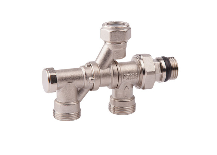 Вузол 4-х ходовий з перемиканням з однотрубного режиму в двотрубний. 2 поворотних виходи для підключення до труб, для нижнього або бокового підключення до радіатора. Вузол поставляється в однотрубної версії. Перемикається вручну в двотрубний режим. У комплекті з фітингом для підключення зовнішньої трубки 15 мм. Міжосьова відстань 50 мм. Кран радіаторний однотрубний / двотрубний, застосовується в однотрубних / двотрубних системах опалення з зовнішньою трубкою. Кран може трансформуватися з однотрубного в двотрубний і навпаки, шляхом повороту внутрішнього гвинта за допомогою шестигранної викрутки.