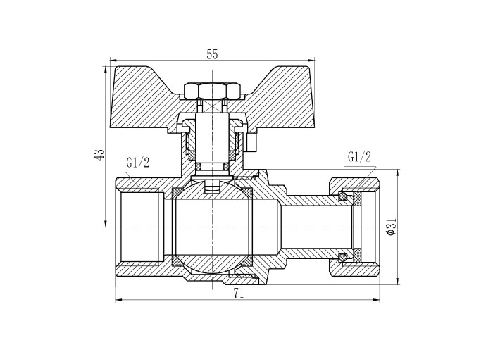 Кран шаровой с накидной гайкой SD Forte 1/2"х ВР для воды прямой выполнен из никелированной латуни. Внутри изделия установлен запорный элемент в виде шара.