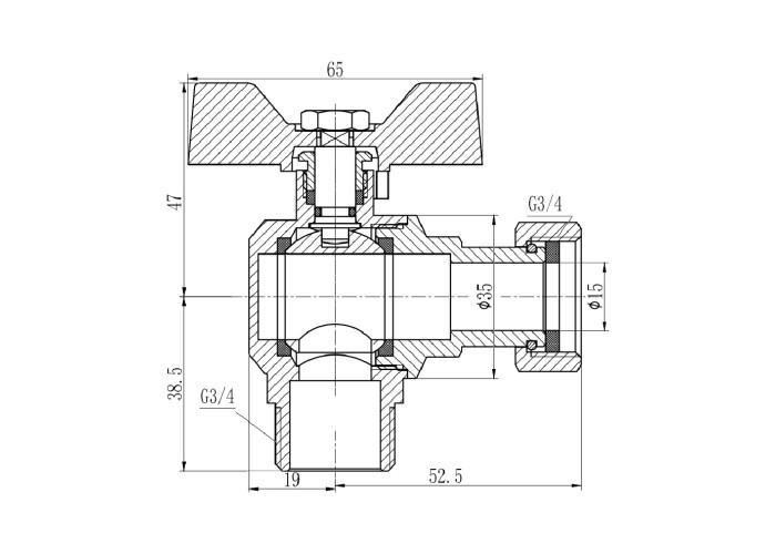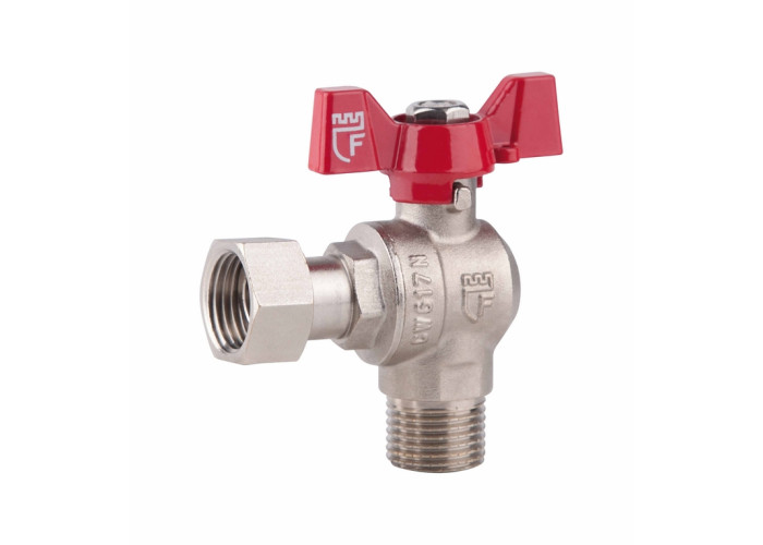 Кран шаровой с накидной гайкой SD Forte подключение 3/4" ВН для воды угловой, материал изготовления — латунь, покрытие — никель.