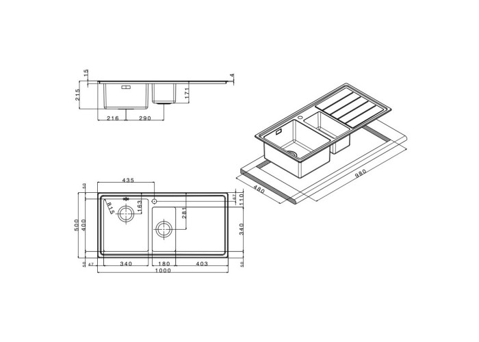 Мойка, сифон, слив/перелив, корзинчатый вентиль с крышкой, уплотнительная лента, крепление, герметик.