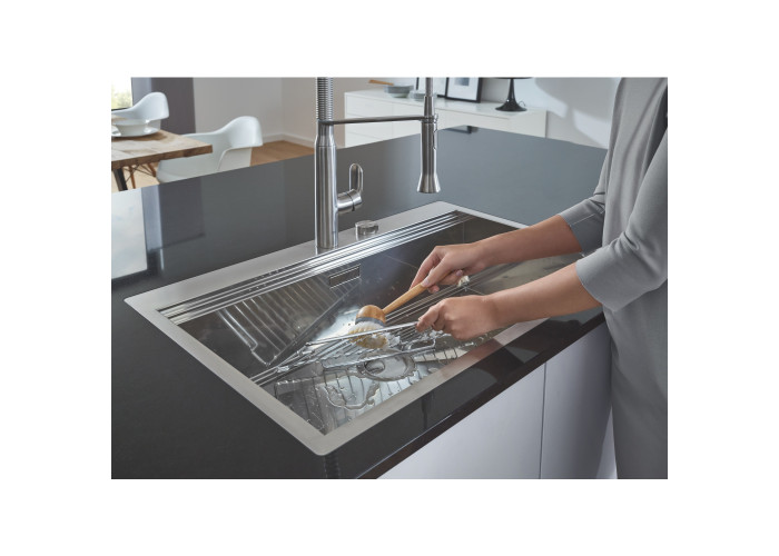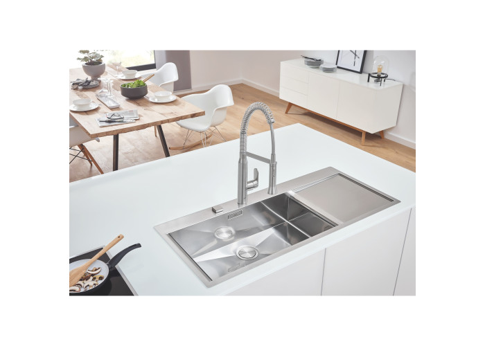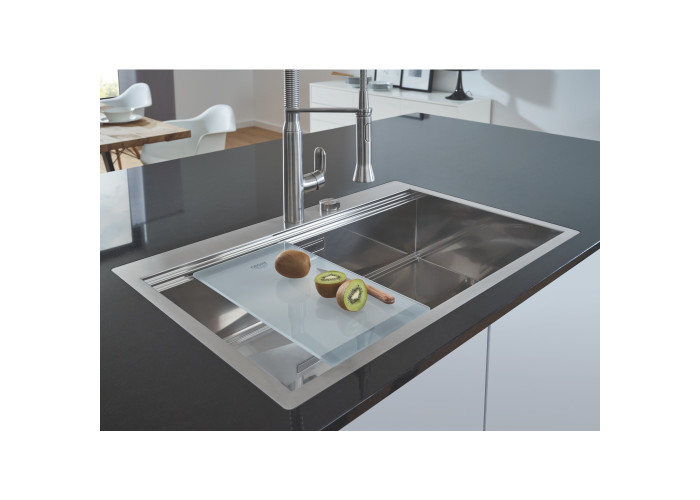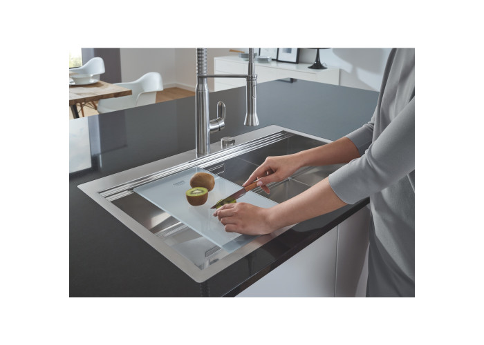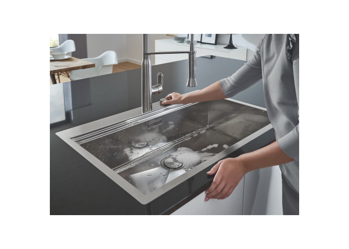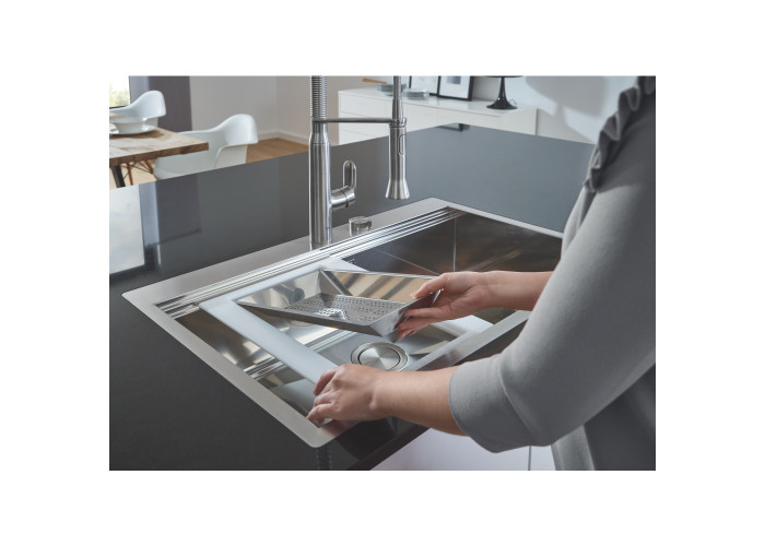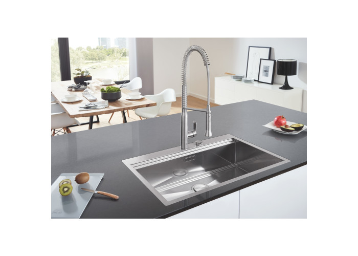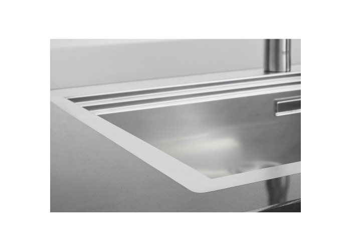 Кухонна мийка Grohe Sink 31581SD0 виготовлена з нержавіючої сталі, що гарантує її надійність і привабливість поверхні. Завдяки системі GROHE QuickFix установлення мийки не візьме багато часу та не потребує додаткового обладнання. Мийка виконана у вигляді чаші з мінімалістичним переливом, скошеним крилом для сушіння посуду і розморожування продуктів. Вона монтується в один рівень зі стільницею. Глибина чаші 20 см робить мийку дуже зручною та практичною. Ізоляція GROHE Whisper.