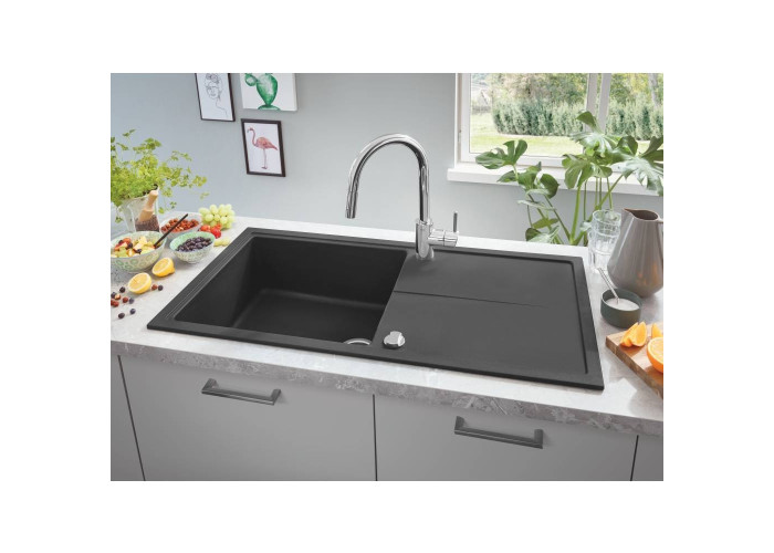 Кухонна мийка Grohe Sink 31641AP0 виготовлена з кварцового композиту, який складається з 80% кварцу та 20% акрилової смоли й затверджувача. Завдяки системі GROHE QuickFix установлення мийки не візьме багато часу та не потребує додаткового обладнання. Мийка виконана з робочою чашею, отвором для змішувача та крилом для сушіння посуду або розморожування продуктів. Ізоляція GROHE Whisper на нижній частині мийки зменшує шум, є автоматичний сміттєзбірник з дистанційним управлінням.