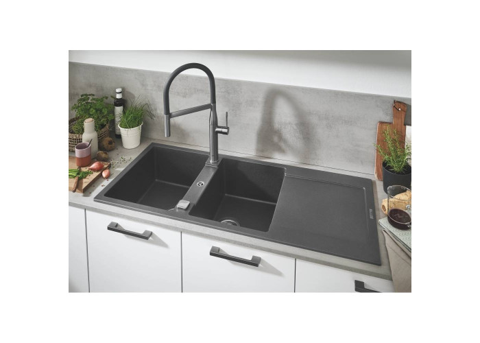 Кухонная мойка Grohe Sink 31647AT0 изготовлена из кварцевого композита, который состоит из 80% кварца и 20% акриловой смолы и отвердителя. Благодаря системе GROHE QuickFix установка мойки не займет много времени и не потребует дополнительного оборудования. Мойка выполнена с двумя рабочими чашами, отверстием под смеситель и крылом для сушки посуды. Изоляция GROHE Whisper на нижней части мойки уменьшает шум, а автоматический мусоросборник с дистанционным управлением разрешает вытащить пробку.