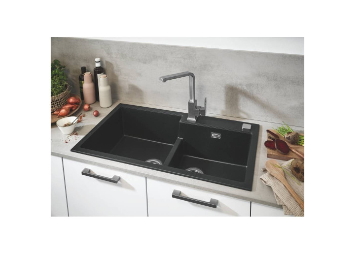 Кухонная мойка Grohe Sink 31649AP0 изготовлена из кварцевого композита, который состоит из 80% кварца и 20% акриловой смолы и отвердителя. Благодаря системе GROHE QuickFix установка мойки не займет много времени и не потребует дополнительного оборудования. Мойка выполнена с двумя чашами с низкой перегородкой и минималистичным переливом. Изоляция GROHE Whisper на нижней части мойки уменьшает шум, а отделка Granite Black не реагирует на ультрафиолетовое излучение.