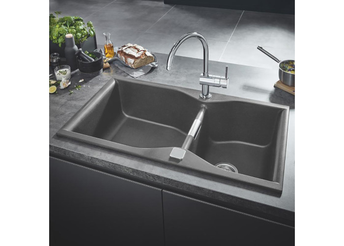 Кухонна мийка Grohe Sink K700 31658AT0 виготовлена з кварцового композиту, який складається з 80% кварцу та 20% акрилової смоли й затверджувача. Завдяки системі GROHE QuickFix установлення мийки не візьме багато часу та не потребує додаткового обладнання. Мийка виконана з двома чашами з низькою перегородкою та мінімалістичним переливом. Ізоляція GROHE Whisper на нижній частині мийки зменшує шум, а обробка Granite Grey не реагує на ультрафіолетове випромінювання.