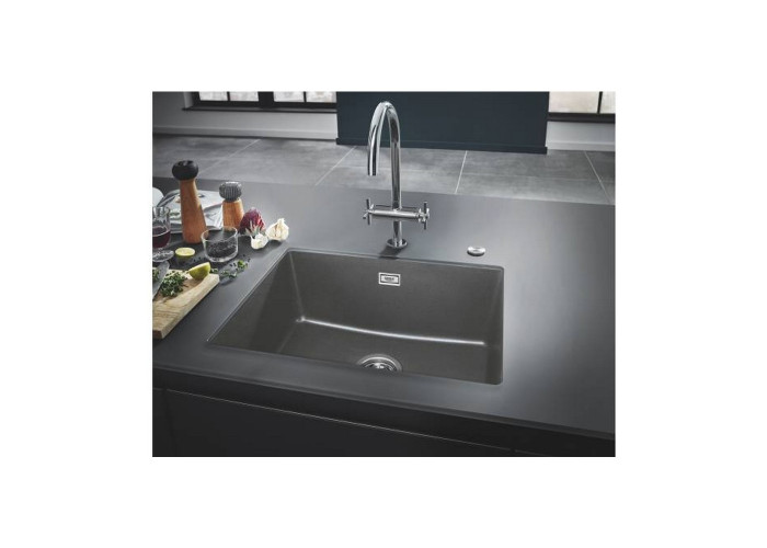 Кухонна мийка Grohe Sink 31655AT0 виготовлена з кварцового композиту, який складається з 80% кварцу та 20% акрилової смоли й затверджувача. Завдяки системі GROHE QuickFix установлення мийки не візьме багато часу та не потребує додаткового обладнання. Мийка виконана у вигляді чаші з отвором злив-перелив. Ізоляція GROHE Whisper на нижній частині мийки зменшує шум, а обробка Granite Black не реагує на ультрафіолетове випромінювання, тому зберігає свій глибокий відтінок протягом багатьох років.