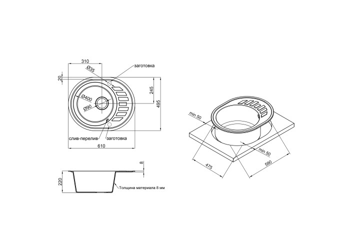 Мийка, сифон, слив / перелив, корзинчатий вентиль.