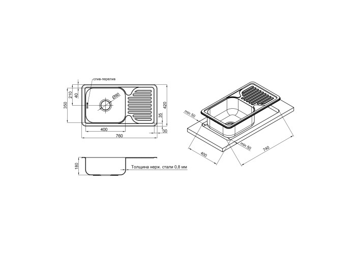 Кухонная мойка Lidz 7642 (0,8 мм) Satin изготовлена из высококачественной нержавеющей стали пищевой марки, поэтому изделие прослужит долгие годы. Так же стоит отметить исключительный дизайн который украсит любую кухню. Отменное качество и дизайн мойки позволят удовлетворить самые высокие требования и создать уют в вашем доме! Мойка выполнена с рабочей прямоугольной чашей, ребристым крылом для сушки посуды и разморозки продуктов. Монтируется врезным способом в отверстие в столешнице.