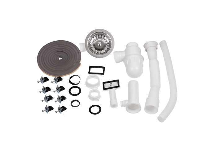 Мийка, сифон, зливник/перелив, кошиковий вентиль, ущільнювальна стрічка, кріплення.