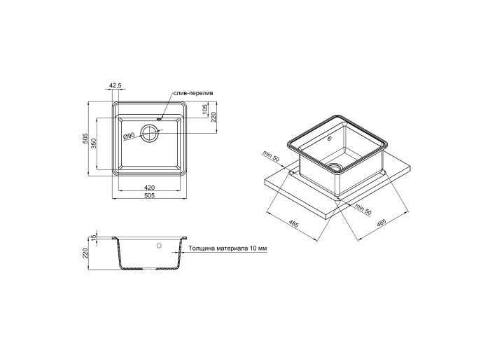 Мийка, сифон, слив / перелив, корзинчатий вентиль, кріплення.