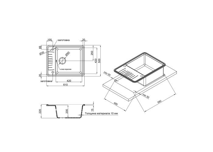 Мойка, сифон, слив/перелив, корзинчатый вентиль, крепежи.