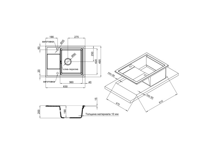 Мийка, сифон, слив / перелив, корзинчатий вентиль, кріплення.