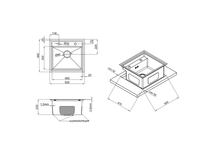 Мойка, сифон, слив/перелив, корзинчатый вентиль, крепеж.