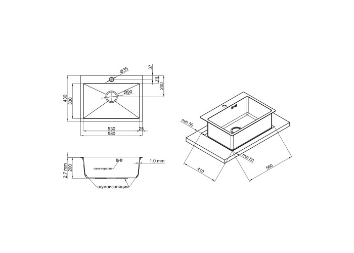 Мойка, сифон, слив/перелив, корзинчатый вентиль, крепежи.