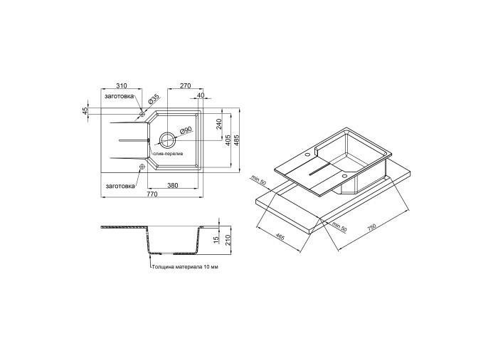 Мойка, сифон, слив/перелив, корзинчатый вентиль, крепежи.